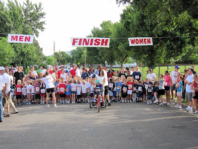 For the 4th of July, we woke up early and the boys ran the Freedom Run 1/4 mile race in Centerville. Well, Thomas ran, and Tyler rode his new bike. Thomas ran really fast. He finished top 20. Tyler was the first to start and the last to finish. As he came down the home stretch, everyone was cheering for him. He worked so hard to get through that finish line, (everyone could see how hard he was working, this was not easy for him!) This was a way cool experience. He was pretty stoic and straight faced, but he felt really proud when he was done and everyone came up to him to congratulate him. Most of them came up to me too with tears in their eyes and told me how great it was that he was doing something like this, and one lady even hugged me, and while crying told me that that experience made her 4th of July. It made my day too!!